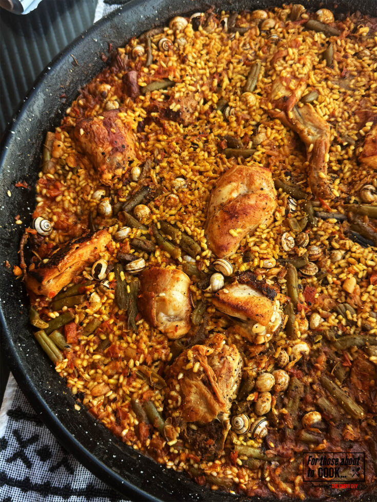 - Step 7: After about 18–20 minutes, the liquid should be absorbed. Just before it is, stir in the snails if using. Increase the heat for the final 1–2 minutes to form the socarrat— the crunchy layer at the bottom. You’ll hear it crackle. Don’t stir!